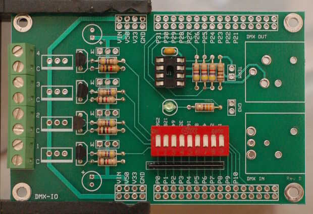 Basado en AN1076 - "Uso de un microcontrolador PIC® para DMX512 comunicación". Código del Microchip modificado y añadido a utilizar 6 canales AdC para 6 canales de datos DMX y la capacidad para compensar su dirección a través de un interruptor d