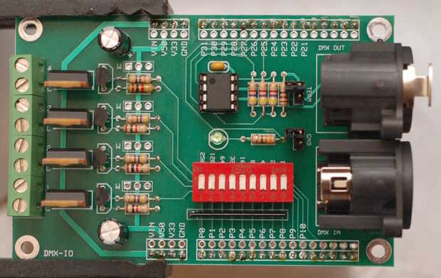 Por último, agregar conectores a la fila exterior del tablero. Estos pernos permiten conectar el módulo IO DMX a la plataforma de hélice, protoboard o breadboard. En el tablero, cada conexión aparece como P0 - P31. El mismo tiene una lista de conexiones (formato expresspcb), pero aquí cómo se asignan