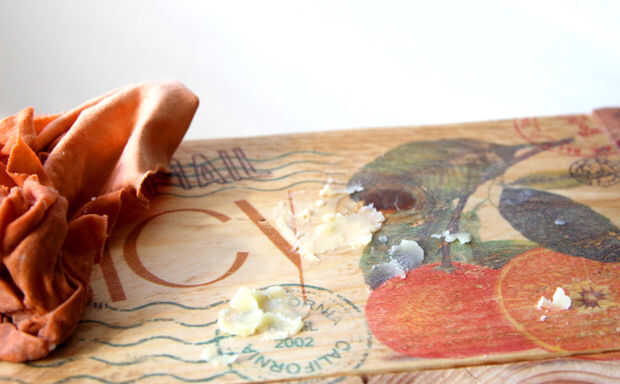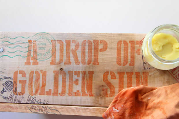 Después de la transferencia de imagen se seque durante un par de horas, el paso final es proteger nuestros cajones con una cera de muebles. Después de algunas investigaciones geek he utilizado la receta de Amber Dusick. Ella hace este delicioso de la cera para sus juguetes de madera. Es 1 parte cera de abejas, 4 partes de jojoba o aceite de oliva (yo usé aceite de oliva). Coloque la cera de las abejas raspado y aceite de oliva en un tazón y poco a poco el calor sobre un baño María hasta que se derrita la cera. Mezclar y transferir a un frasco.