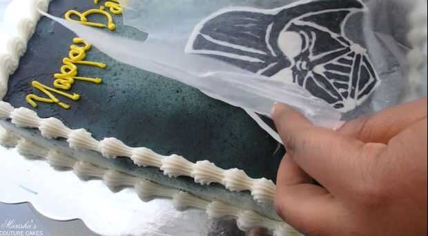 Cuando la transferencia es firme. Voltee y decidir dónde hacer la transferencia sin realmente sentado en la torta. Cuando esté listo, coloque a la transferencia en el lugar designado y suavemente comienza a despegar el papel encerado. Hacia rápido puede romper la transferencia. Después de que el papel se quita totalmente, pequeñas lagunas en la superficie de la transferencia pueden llenarse con la crema de mantequilla.
