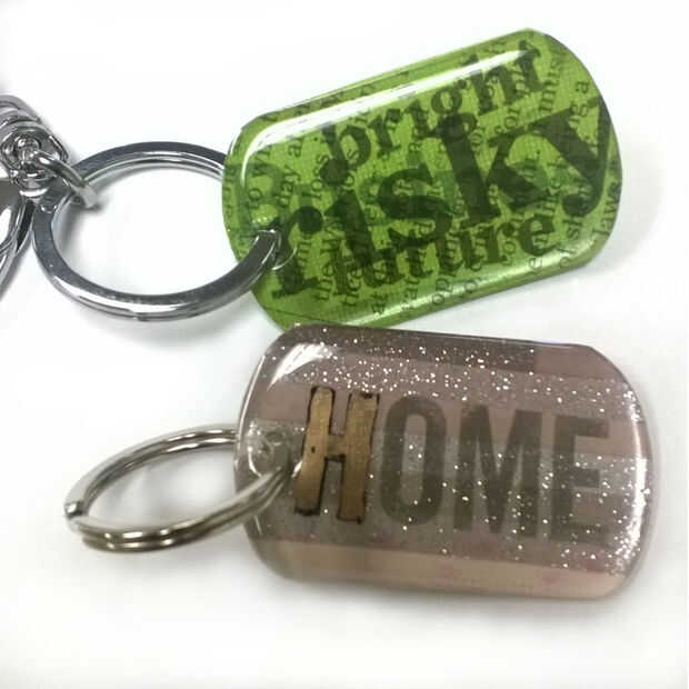 Tenemos epoxy cúpula etiquetas de perro en el trabajo y una de las ideas que tenía para ellos es con la transferencia de la imagen. La técnica para el "Hogar" y "Arriesgada, futuro brillante" es sobre el mismo. Usar el llavero de "Inicio" a la técnica de demostración y luego se muestran los pasos para "Arriesgado" al final. Es esencialmente la misma cosa repetida para hacer capas.