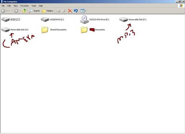 Con "Mi PC" abrir Localice la cámara. Con mi versión de windows aparece como un disco externo. Esto a menudo lo hago sé que seleccionar. Llego a cargar mi reproductor de mp3 en el momento, desde que se conectó primero aparece por orden alfabético ante la cámara, conectada a la última.