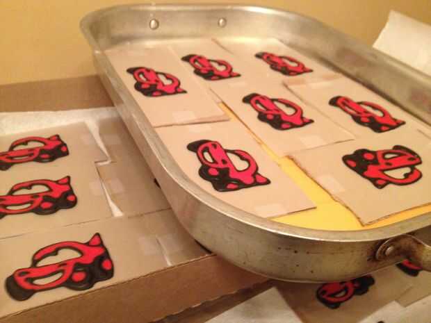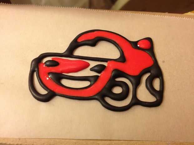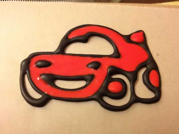 Comience con la base. El color de la carrocería del coche viene antes de las luces en los faros. Así que el color base y use un palillo de dientes o un tenedor o algo puntiagudo para ayudar a la formación de hielo en los bordes de tu diseño. Asegúrese de que es lo suficientemente gruesa, cumple con todos los bordes y cuando veas burbujas, reventarlas cuanto antes con un palillo de dientes afilado.