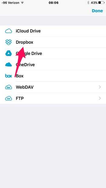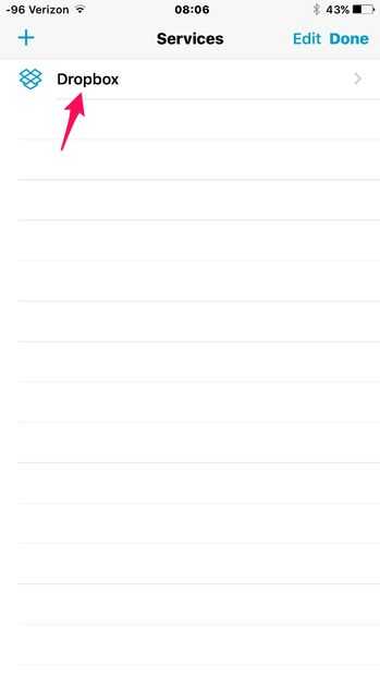 7. toque en DropBox en la lista de servicios. Ahora verá la lista de servicios otra vez con Dropbox aparece