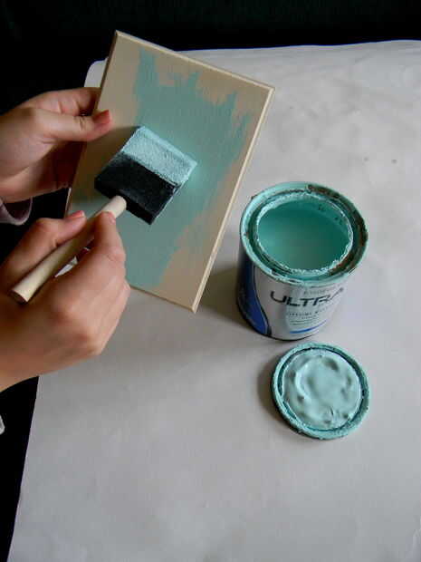 1.) después de que los suministros se compra tomar los trozos de madera, (encontré pequeños pedazos finos de 5 x 7 en Wal-Mart de 97 centavos de dólar) y pintar cualquier color de su elección, me encontré con esponja pintura pinceles deja menos rayas a lo largo de todo este proceso. Utilizando negro para fotografías en blanco y negro se ve muy aseado pero había sobrado pintura azul pálida y decidió usar este tiempo para ver cómo resultaron.