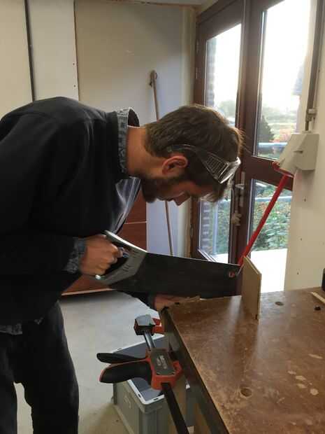 Hay una pequeña sierra de mano y tome el pequeño pedazo de madera por que de pie en su camino.