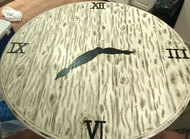 He pintado en una cara de reloj con sólo el 12, 6, 3 y 9 números romanos sobre ellos. Originalmente iba a pintar con una plantilla (demasiado dinero para comprar las plantillas)!, o con cinta de pintor estratégicamente - y ridículamente meticulosa, crear espacios para el número de líneas ir (al igual que hice para las líneas de la tabla). Pero, no sólo era listo a hacerse en este punto, pero me di cuenta que no quería que mi mesa sea perfecto en el primer lugar (¿recuerdas la paliza?), por lo que sólo libre de manos los números, así como las agujas del reloj centro.