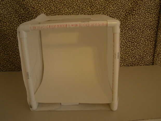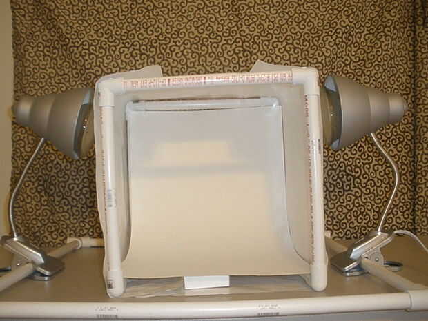 Corte un pequeño agujero en la parte superior de la caja para algunos disparos de arriba hacia abajo, pero no hacerla demasiado grande ya que necesito el fulgor de la parte superior para superficies reflectantes.