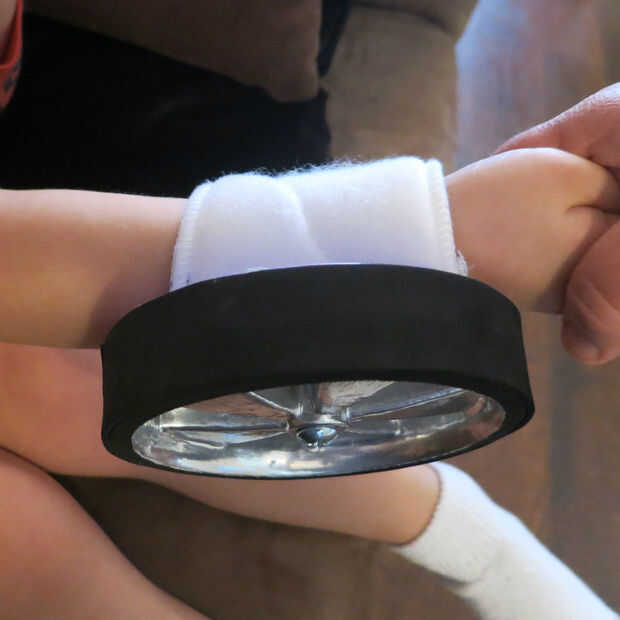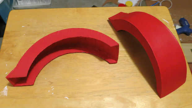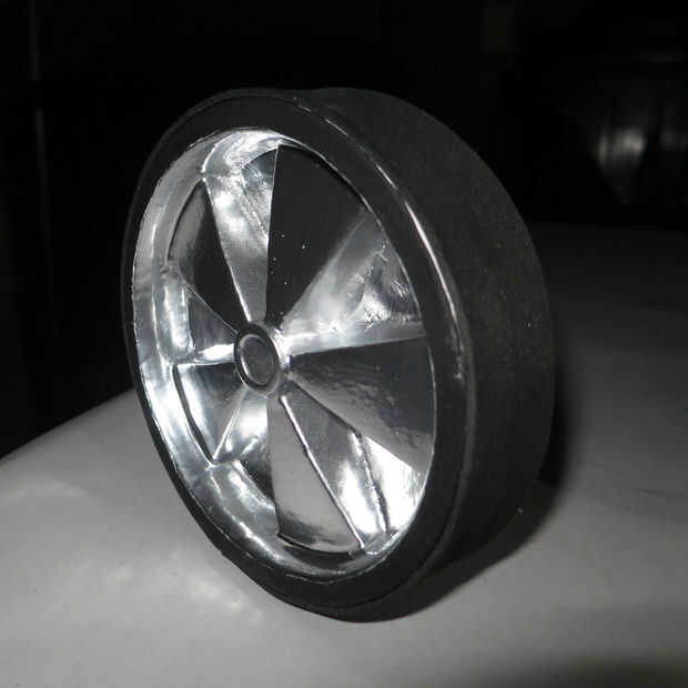 Las ruedas estaban 4.25" diámetro bicicleta las ruedas de entrenamiento. El área de la llanta de la rueda fue pintado con Gesso de acrílico artistas Loft blanco y pintado con Krylon Premium Original cromado pintura de aerosol metálica. Las ruedas fueron atadas a mis antebrazos hijos aplicar rodilla acolchada con correas de velcro.