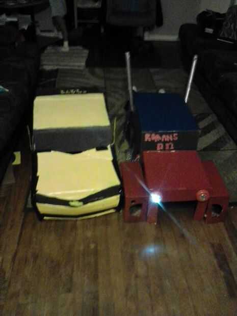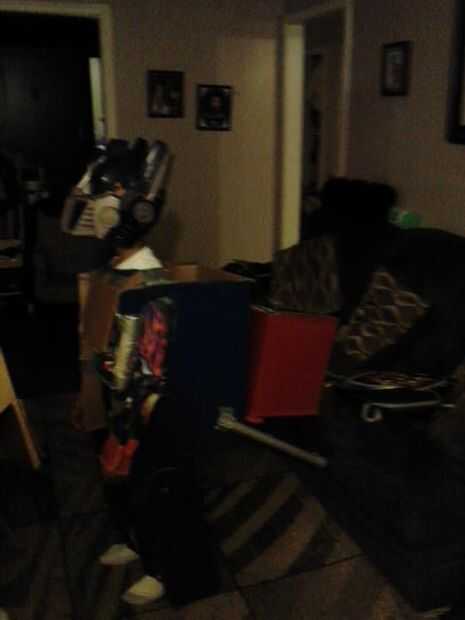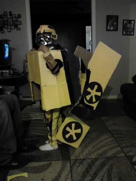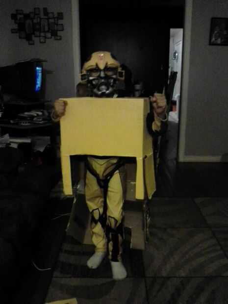 Grande gritar a todos de las tiendas que estaban dispuestas a dar a sus cajas. Otro grito hacia fuera a la tienda de pantalones de Sherwin Williams que me vendió el galón de pintura amarilla por $5.00. Los trajes fueron comprados fuera de ebay. Y la cabeza de Optimus Prime habla era un regalo para la Navidad. Costo para el traje era menos de $60,00 total