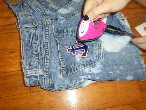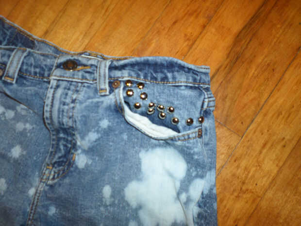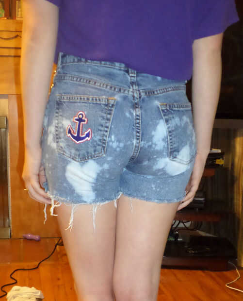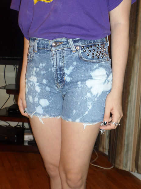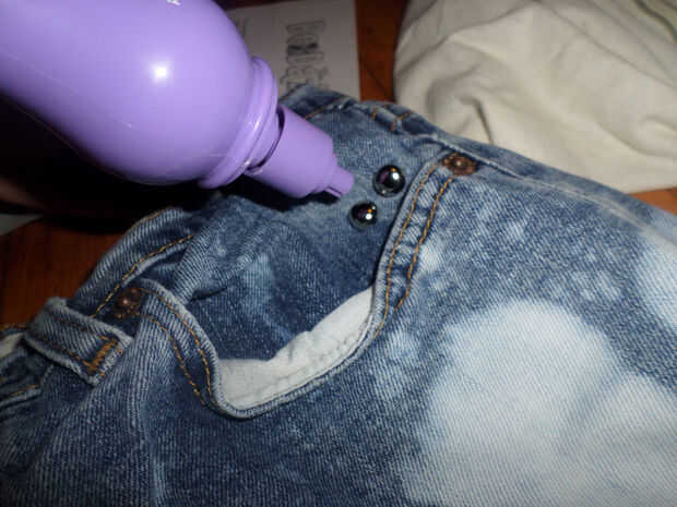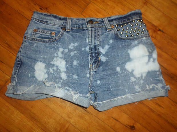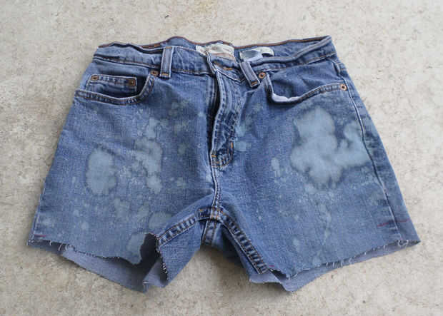 3) tomar los cortos a un área segura fuera de uso la paja salpicaduras lejía en los pantalones cortos. (llevar ropa que no te importa subir bleach)