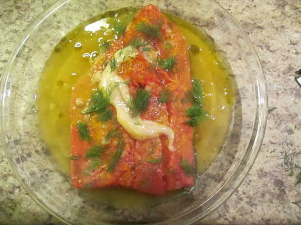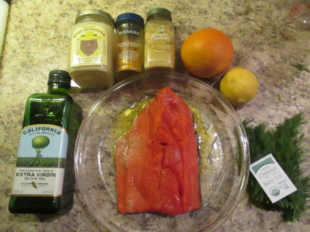 Espolvorear con cúrcuma, bebé y mostaza de eneldo.