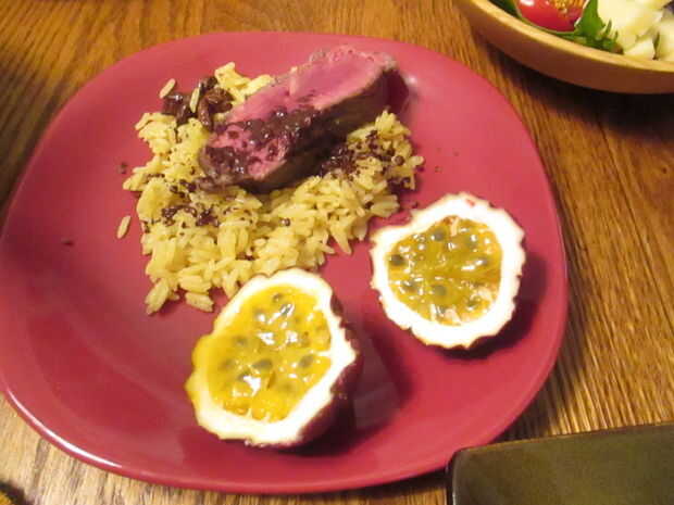Fruta de la pasión sirve con el arroz, randy, que se remata con una suculenta loncha de carne.