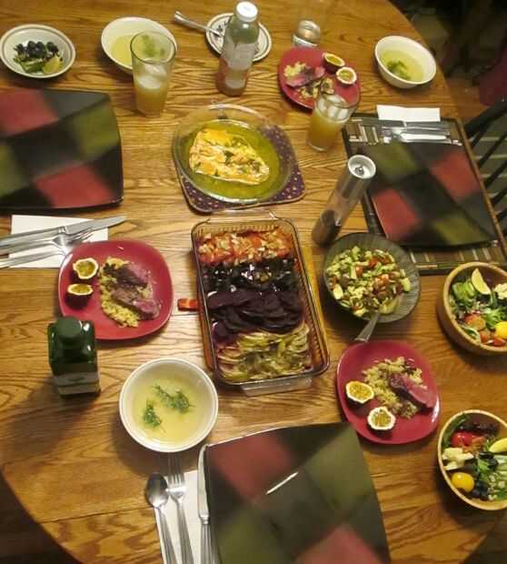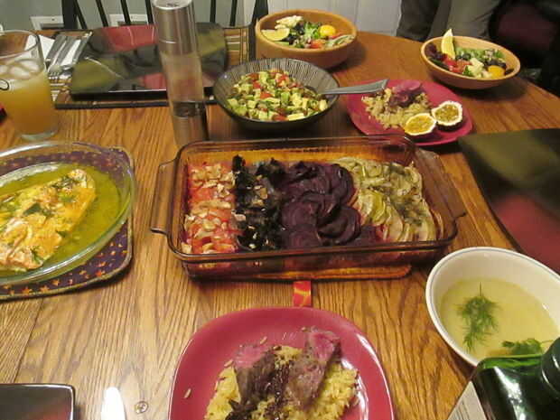 Una cornucopia de frutas y verduras asadas.