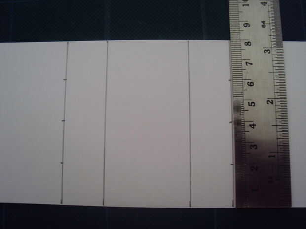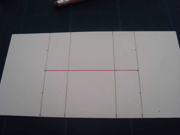 a lo largo de las líneas exteriores que ha gobernado solo, hacer marcas más 1/4, 2/4 y 3/4 la manera en ambos lados. La regla una línea a través de las marcas medianas como se muestra en la red.
