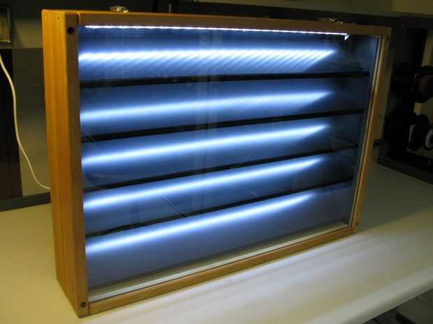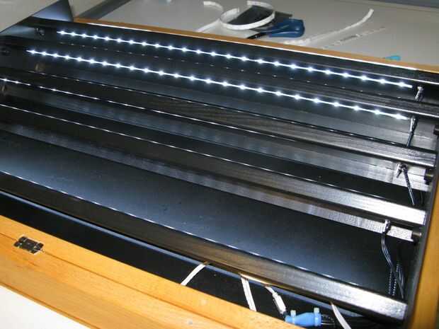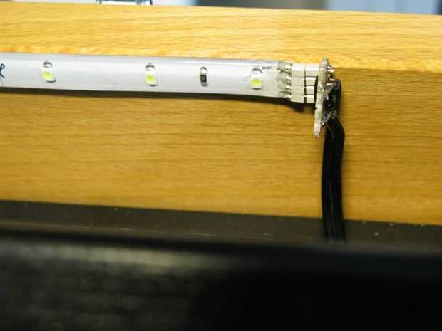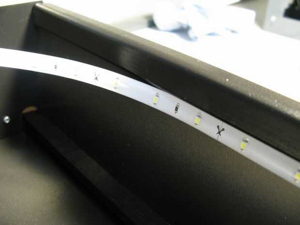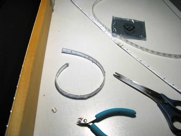 Las bandas de LED que encontré consisten en tiras de 1 metro de plástico transparente, que contiene LEDs (conectados en paralelo por grupos de 3 LEDs en serie) y sus resistencias. La parte posterior de las bandas tiene espuma adhesiva. Las bandas pueden ser alimentadas en serie o en paralelo con un dedicado de 12 V de la fuente.