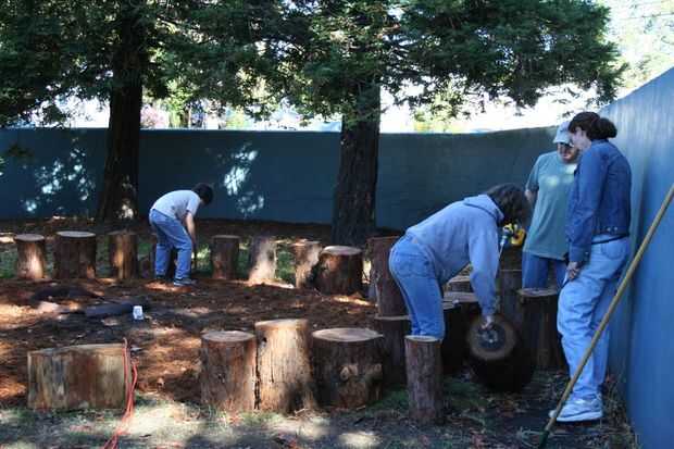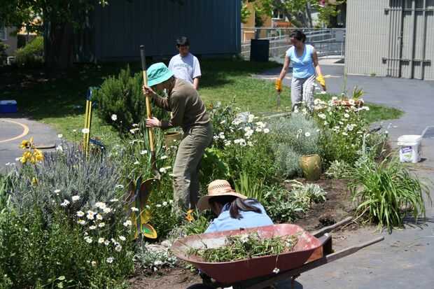 Mejora de la escuela con vegetación, flores, arte, asientos y sombra beneficia no sólo a los estudiantes, sino también a toda la comunidad. Impulsa a la gente a detenerse y a entablar conversaciones. Por ejemplo, al diseñar un muro de contención para evitar que el barro por streaming en el patio de recreo en días de lluvia, nos aseguró que era una altura cómoda. Esencialmente se convirtió en un banco largo de 150 pies donde los niños sentarse juntos para tener su almuerzo y padres relajarse y chatear mientras ven a sus hijos jugar antes y después de la escuela.