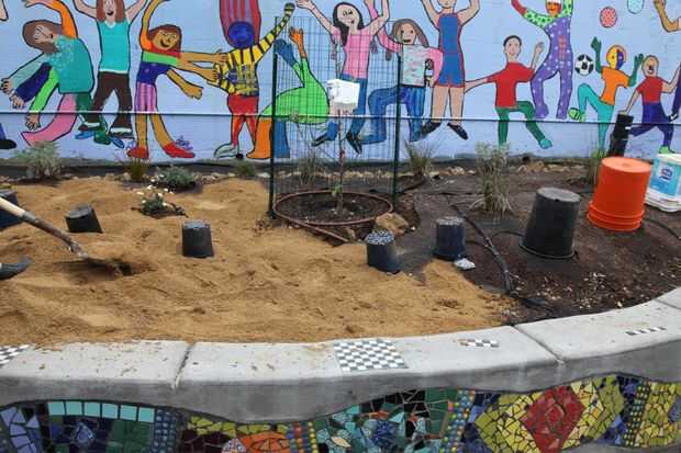 - Decidimos mantener la superficie de asfalto existente en la zona del jardín cama elevada en lugar de desenterrar para minimizar las malas hierbas y evitar pajote de seguimiento en las aulas. (Aislamos el suelo de asfalto con capas de tela de filtro y grava).