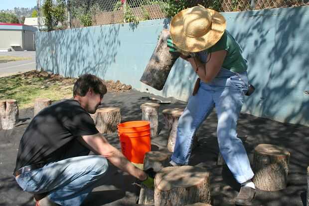 - Tocón de árbol asiento se fija en el suelo para que no se volcará cuando niños saltan de uno a otro.