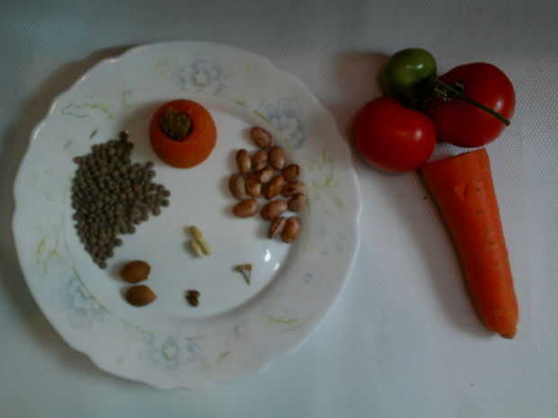 Las semillas de la foto son lentejas, habas, limón, bahías semillas, manzana y ciruela. Junto con algunos tomates cultivados por mí y la zanahoria a revegetar.