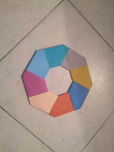 Paso 1:Necesita 1 pedazo de papel cuadrado de un color, 4 pedazos de un papel cuadrado de colores diferentes y 4 pedazos de papel de otro colorPaso 2: Un color de papel del doblez sobre aquíPaso 3: Dale la vueltaPaso 4: Hacer el pliegue a lo largo de