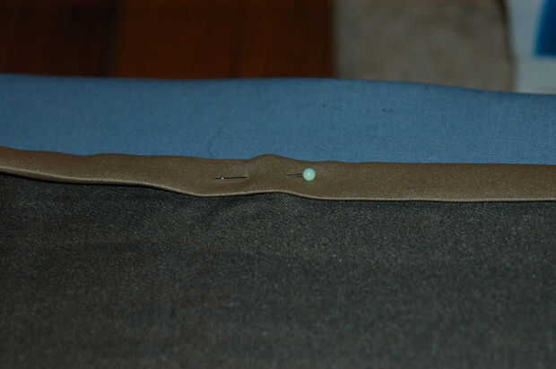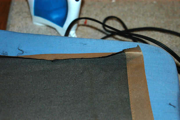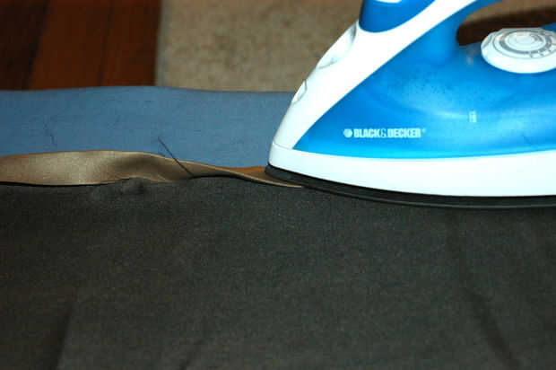 • Doblar la parte inferior del material a preparar para dobladillar. Puede que necesite poner algo de agua plancha para cocinar al vapor o usar algo para ayudar a mantener el material planchado y aplanado.