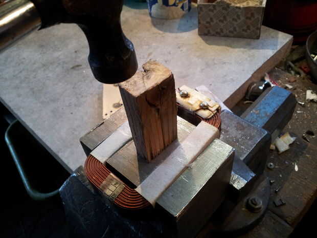 Tome el primer transformador y cortar la soldadura con el arco de sierra en ambos lados. Luego la perilla con el martillo al lado de la soldadura. La parte inferior se debe romper y debería verse como la imagen 2. Abra el vicio y la bobina a la caída del busto. Ahora toma un trozo de madera y ponerlo en el centro de la base de hierro. Ahora tome la perilla en la pieza de madera y martillo (uno en la fotografía es a pequeñas :-)). Las bobinas deben salir y usted conseguirá las piezas en el cuadro 4 (y una pequeña bobina roja que falta en la fotografía). Sólo necesita la bobina primaria (el uno con el cable grueso). Hacer lo mismo con el segundo transformador.