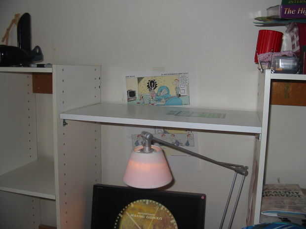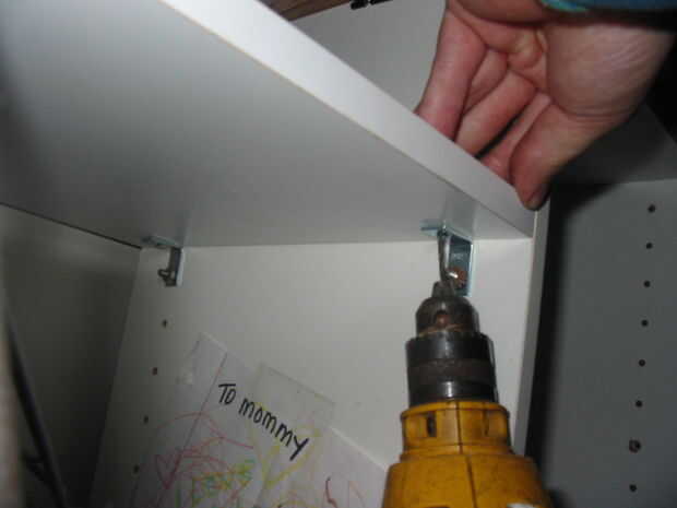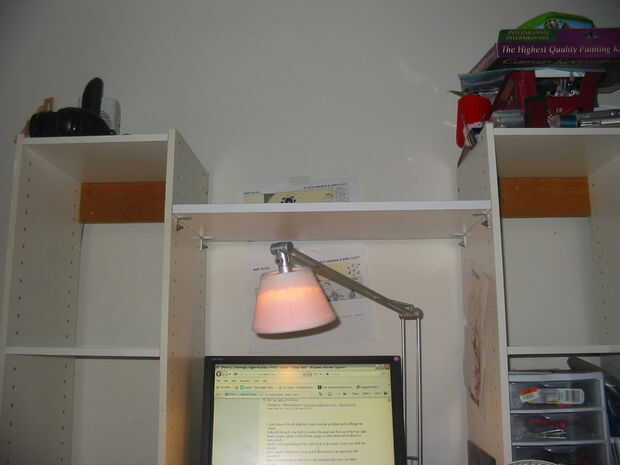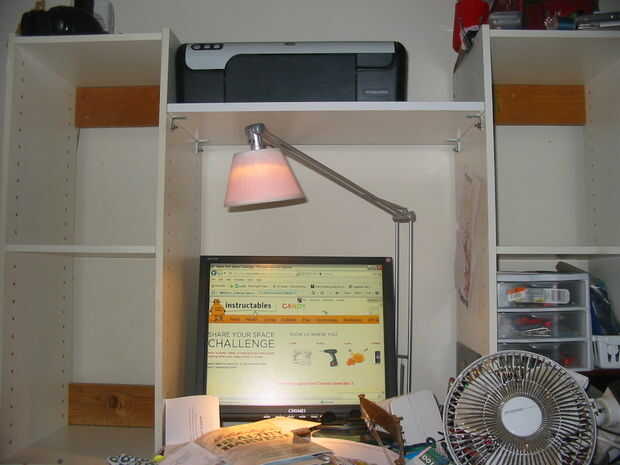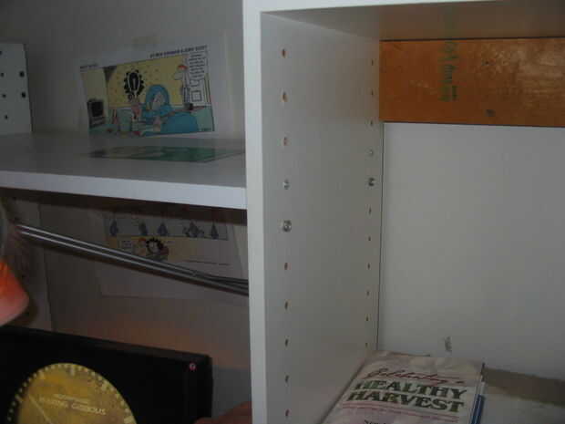 Mi idea era conectar las dos unidades con un estándar de la estantería de la tienda de hard ware. Rescatado los estantes y las puertas de un armario decrépito que trashed. Era prensa Junta cosas y cayendo por su propio peso. Utilizado para hacer los estantes en las unidades, de hecho 4 con ellos. El blanco uno entre las unidades medido el espacio entre las unidades cuando estaban sentados en el escritorio. Medir y cortar el estante de la derecha. Ya tenía algunos de lo hardware que necesitaba para esto, pero los soportes en L forma que tuve que comprar en la ferretería local. Después de decidir donde debe ir el estante me coloca los tornillos por los agujeros de las unidades entonces los soportes y apretar las tuercas. Taladré agujeros en el estante de los soportes mientras se encontraba en posición de los soportes. Aunque las fotos no muestran esto, cuando haya terminado de enroscar el estante y usando pinzas para sujetar el interior estantes arriba coloqué algunas cestas y cajas en los estantes y la impresora pasó en el estante el equipo con un pequeño estante de compartimiento. Los estantes de abajo son para portátiles y mini cajón Organizador del ahe.
