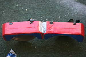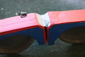 La ruedas del remolque ejes descansan sobre la parte exterior de cada pierna, y están asegurados mediante elástico.