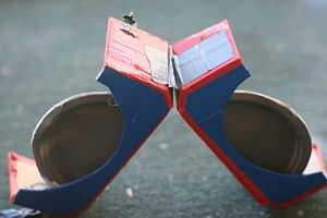 Pintura de aerosol 2 platos de papel de tamaño postre con pintura en aerosol negro o/color de la pintura les negro con un marcador. Corte cada plato por la mitad y y las "ruedas" en el interior de los nudos con cinta adhesiva y pegamento caliente.