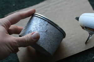 Unir dos tapas de boca ancha metal conservas frasco con los lados plata hacia fuera. Pegamento caliente ahora la cinta del rodillo a la parte superior de las tapas de metal. Lugar su bajo luces de gabinete * dentro del rollo para crear una linterna. Repita para el otro.