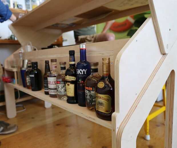 El diseño incluye una pared con respaldo de corcho en la parte posterior de la mesa que gira el pasador de madera puestos en los lados de la mesa. Simplemente tire de la mesa de la pared, pliegue hacia abajo de la pared posterior, y se convierte en un bar con capacidad para 3 en heces. Un canal en la parte posterior de la mesa (oculto por la barra superior cuando es hacia abajo) tiene espacio para 20 botellas, un estante para el desgaste de la barra y un rincón empotrado para un cubo de hielo o tabla de cortar.