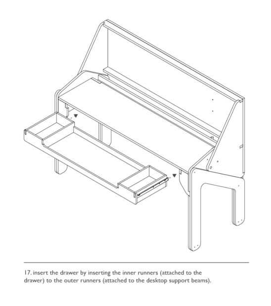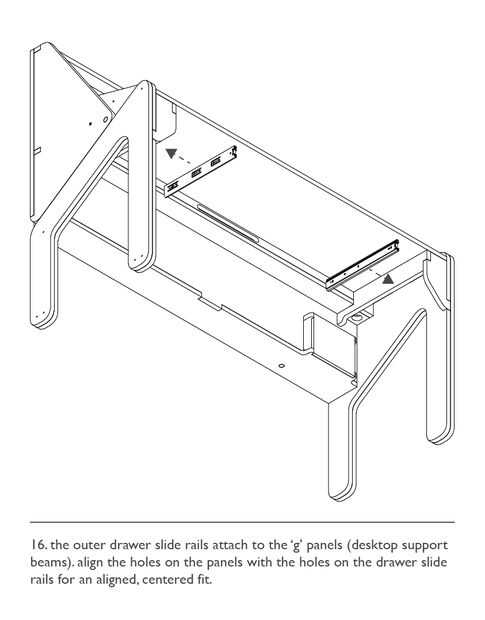 A continuación, alineados los orificios en los carriles exteriores de las correderas con los previamente perforados en las vigas del escritorio. \