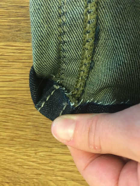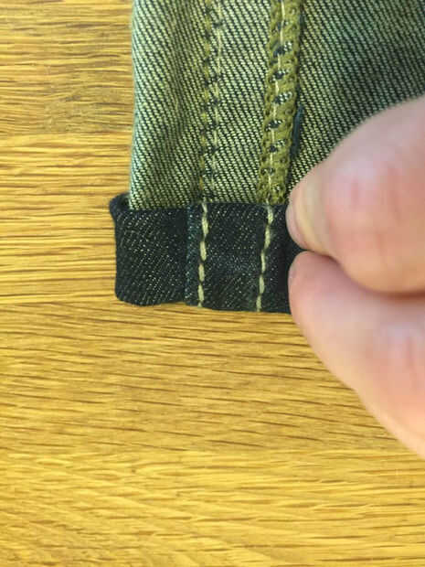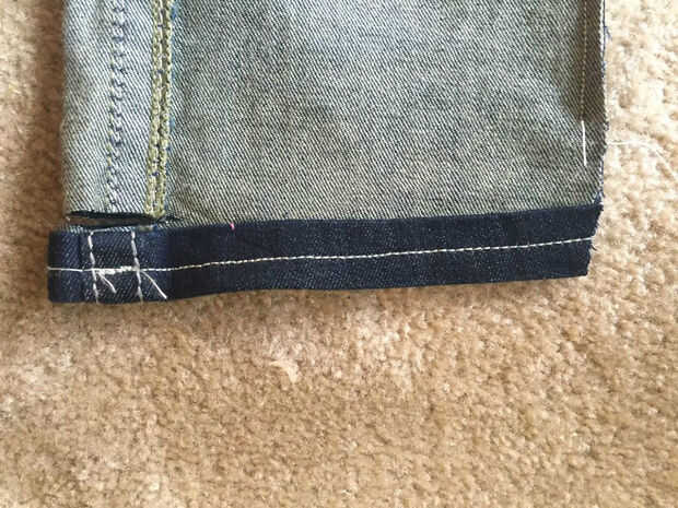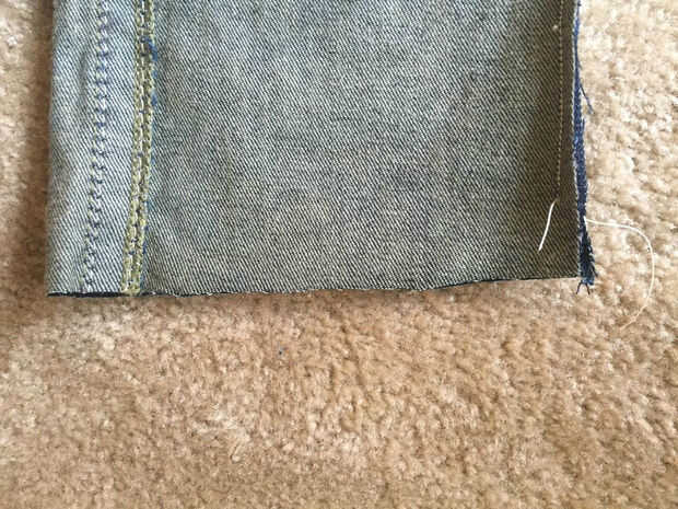 16 si eres feliz con la anchura de los vaqueros, estás listo para sus nuevos pantalones vaqueros de la roca. Si desea acortar la longitud, recorte el tejido sobrante de los extremos de las patas. Para mí, quería que mis jeans cerca de 1.5" de más corto, así que cortado unos 3/4" (que casualmente era la longitud del dobladillo existente)