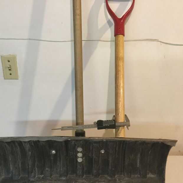 -Tome una pinza y tenga en cuenta el diámetro de la manija recuperada y de la herramienta que desea ser ergonómico, un empujador de nieve en mi ejemplo. Si no tienes un calibrador, toma una regla con un lápiz y después de hacer una proyección de dos lados en una hoja de papel, tomar nota del diámetro de cada manija.