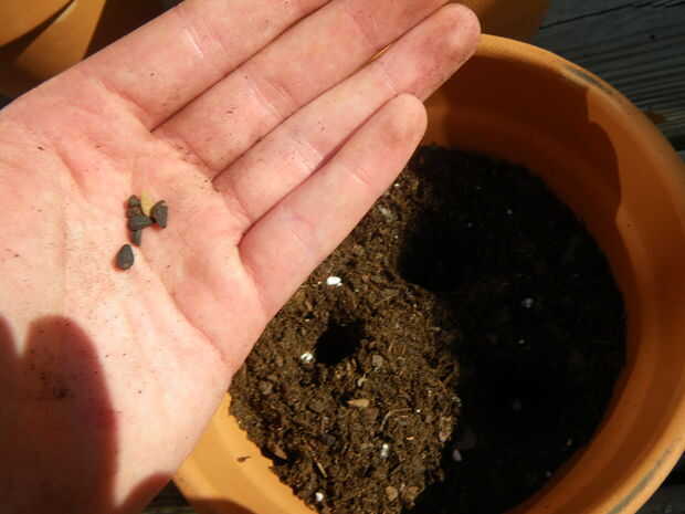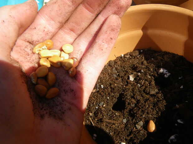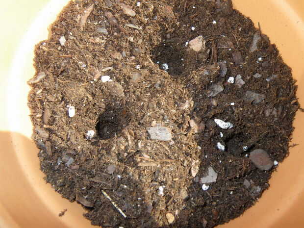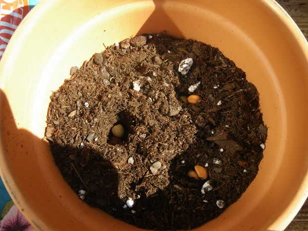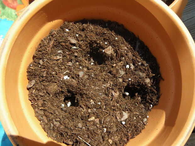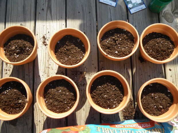 Ahora es el momento para plantar las semillas. Con su dedo, meter 3 agujeros en el suelo 1/2 pulgada de profundidad. Cae 1-3 semillas en cada agujero y cubrir. Necesita poner la gloria de la mañana en mitad de las macetas y flores de luna en la otra mitad. Es más fácil separar las macetas en filas para hacer esto.