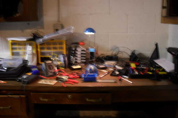 en el trabajo encontré este viejo escritorio que ha sido desechado porque tenía una pierna inferior que falta. Lo tomé casa donde incluso, cortar la otra pierna con el otro lado y añadí las ruedas para moverse en mi sótano. Más adelante voy a pasar todas mis herramientas y suministros para mi hobby de la electrónica y voy a empezar a trabajar en algunas cosas pronto.