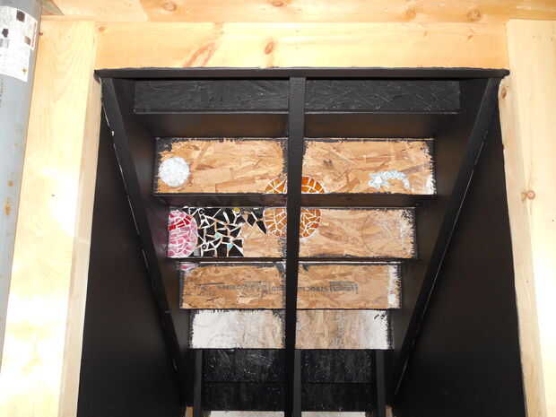 He utilizado pegamento mastic para los azulejos más pesados (usé apenas básicos azulejos negro cerámica para la parte de espacio y azulejos de colores negros y galletas para el letrero sobre la puerta... ambos requieren masilla).