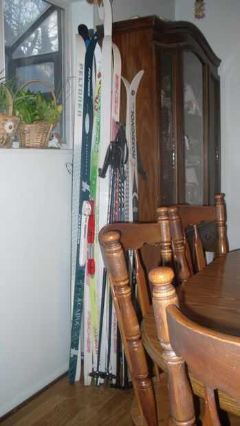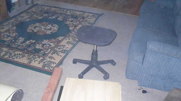 Esta temporada es un poco diferente. El éxito que tuvimos el año pasado nos llevó a comprar esquís para los otros miembros de mi familia. Ahora estamos a seis juegos de esquís y la esquina no es un buen lugar para esconder ese engranaje. Fue con este problema en cuenta que empecé a mirar alrededor para algo que podría ser utilizado como un portaesquís. El obstáculo principal que tenía que cruzar fue gestión de espacio. Con seis personas en mi casa, no hay espacio para mucho. La solución llegó en forma de un viejo sin espalda (la parte posterior había sido quitada en algún momento en el pasado) silla de oficina. Un estante giratorio de esquí conseguirían muy bien.