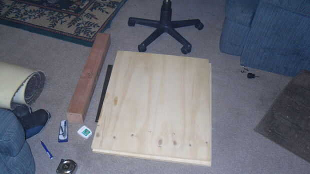Todos los materiales utilizados en este proyecto deben ser fácilmente disponibles en lugares como Home Depot, Menards, son tiendas similares. La silla de oficina se puede encontrar en tiendas de segunda mano, en la acera para ser quitado con la basura, o en otros lugares más imaginativos. El único criterio para la silla es que es estable y el pivote de asiento es libre de moverse. Las herramientas eran también los que ya tengo. Utilicé una sierra de inglete compuesto para hacer los cortes en la madera pero incluso una sierra de mano conseguirá el trabajo hecho. Compás, lápiz, alfiler, hilo (a explicar), cinta métrica, regla de acero, taladro inalámbrico, un poco de tornillo, un pedacito de taladro de torcedura, una sierra de calar con una hoja de madera, pinzas y una mesa robusta. Estas son las herramientas que utiliza, ya que con los materiales, puede también ser adaptadas y sustituidos como necesidad dicta.
