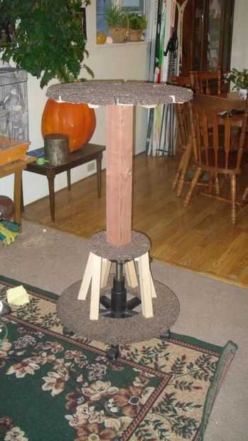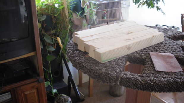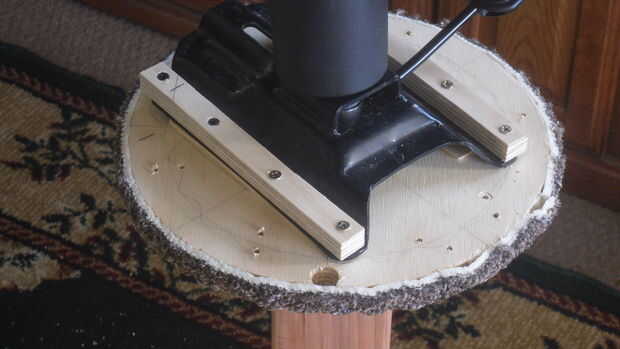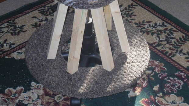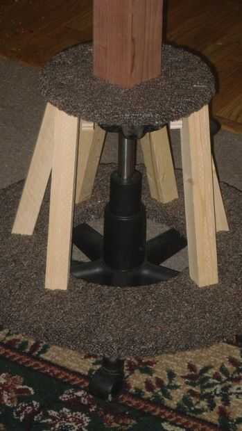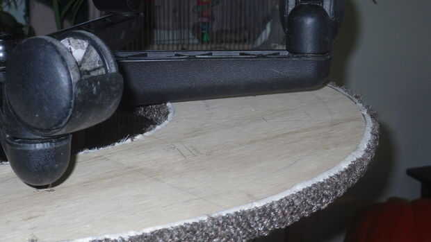 Cada extremo de las seis piezas utilizado se redujo a unos 14 grados para tener en cuenta el cambio horizontal entre el centro y el anillo base. Otra vez, tornillos de madera y pegamento fueron utilizados para atarlos todos juntos. Una palabra de advertencia, taladros de la torcedura alfombra de comer vorazmente! Sea cuidadoso cuando taladre los orificios para los tornillos a través de la alfombra.