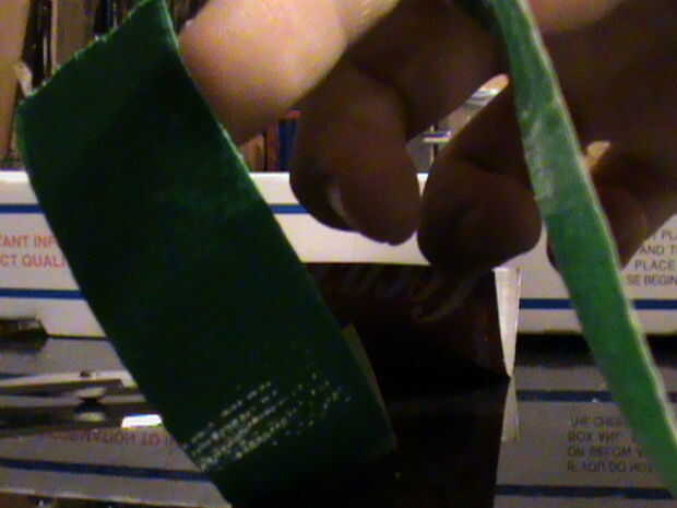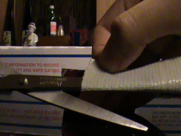 Cortar un trozo de cinta que es de unos 6cm.   Corte la cinta por la mitad (manteniendo la longitud de la misma).  Que el cuerpo envolviendo una de las piezas de cinta alrededor de los extremos y la aguja la punta de la cinta.
