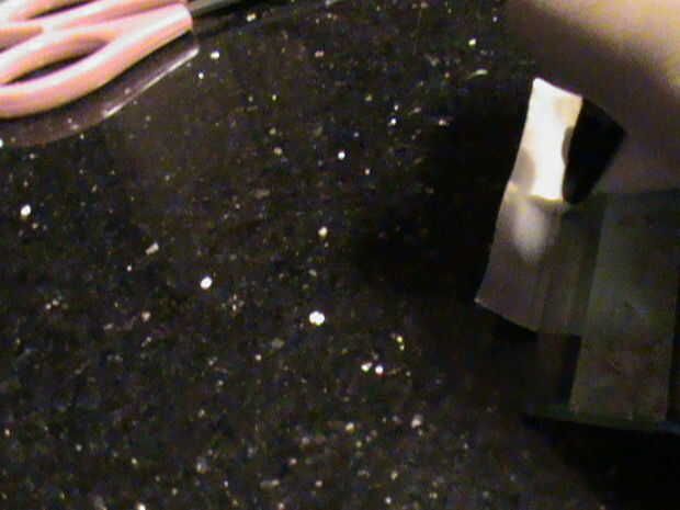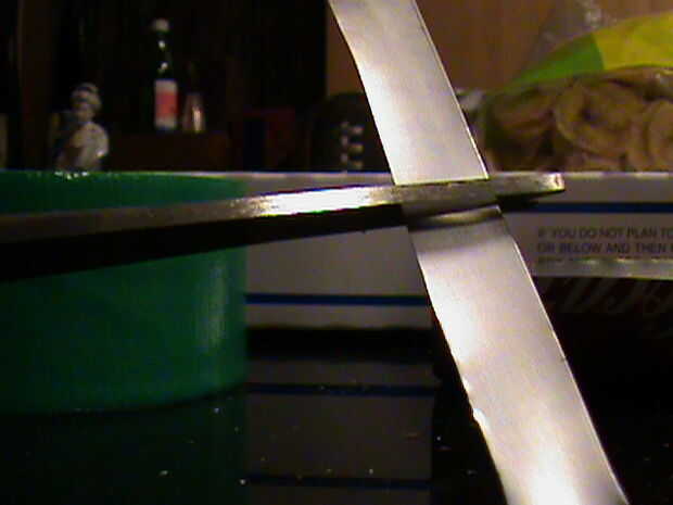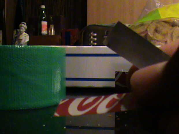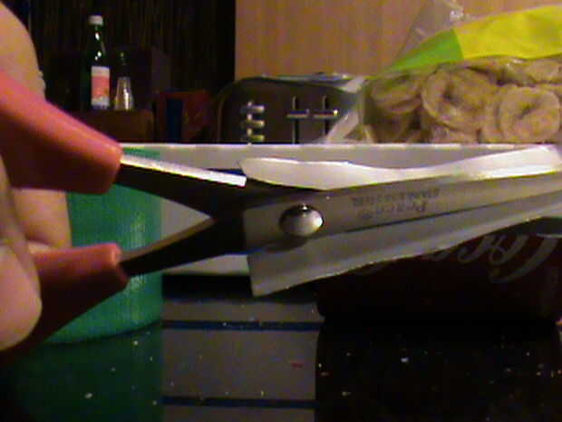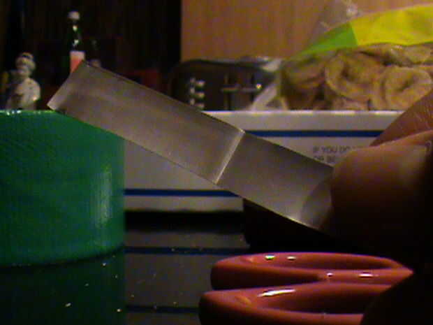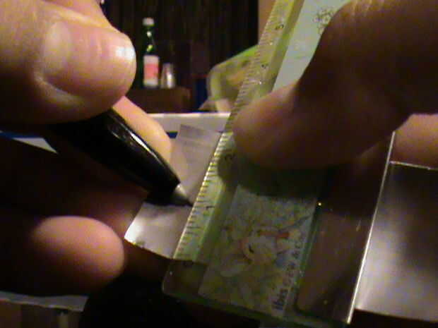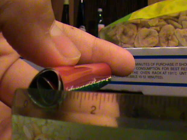 Mida el diámetro de la vara y recordar la medida. Con el resto de la lata, cortar una tira de metal que es tan ancha como el diámetro de su memoria y tan largo como el diámetro multiplicado por 6. Así, en mi caso, la franja sería 1cm de ancho y 6cm de largo. Doblar la tira por la mitad (hamburguesa), abra la tapa y cortar por el doblez. Debe tener dos tiras.