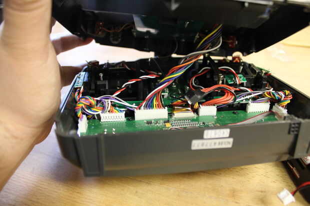 Lo primero es quitar la tapa y la batería dentro. a continuación afloje los seis tornillos en la parte posterior de la unidad y levante suavemente la parte posterior de la caja. Desenchufe el conector largo en el medio sosteniendo las dos mitades juntas. reservamos medio la parte de atrás.