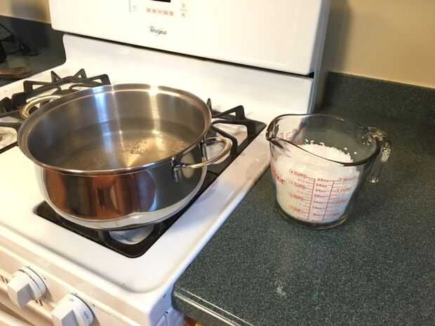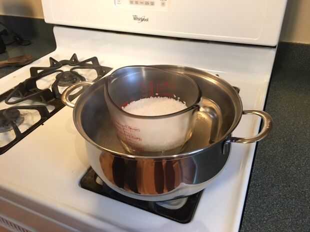 - Hervir agua en una cacerola. El agua debe ser lo suficientemente alto para cubrir alrededor del 50-75% de la taza de medición, pero se baja bastante donde el agua hirviendo no salpicar en la cera.