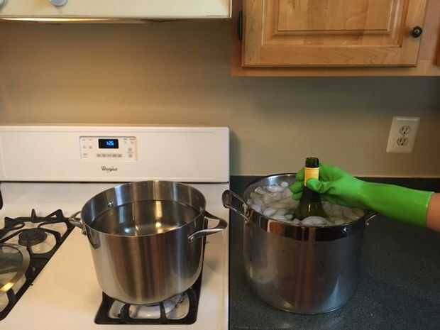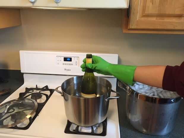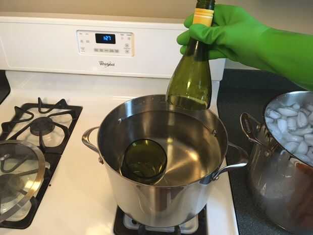 - Usando guantes, inserte la botella completamente vertical (no inclinada) en a olla de extremadamente caliente / apenas hervir agua. En mi experiencia, agua hirviendo solía agrietarse los lados de la botella o causar una rotura irregular en la Copa. Asegúrese de que usted sumerja completamente la línea grabada en la agua caliente.