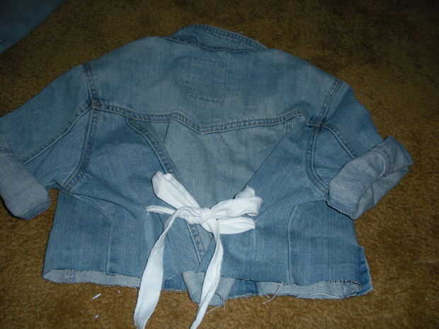 2. Tome su tela extra o cinta o lo que sea va a utilizar para hacer el arco (yo uso el cáñamo de una camisa blanca de algodón) y alimentación a través de ambos agujeros para que la parte larga de la cadena está en el interior y los dos extremos de las cadenas se reúnen en el exterior de la chaqueta.