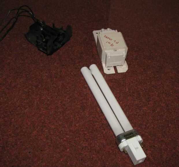 Mi lámpara fue impulsado por una CFL de 9W (Phillips PL) y tenía un lastre en la base.