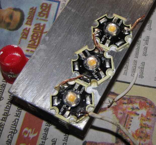 LEDs se aseguraron para el bloque con pasta térmica y una gota de pegamento térmico.
