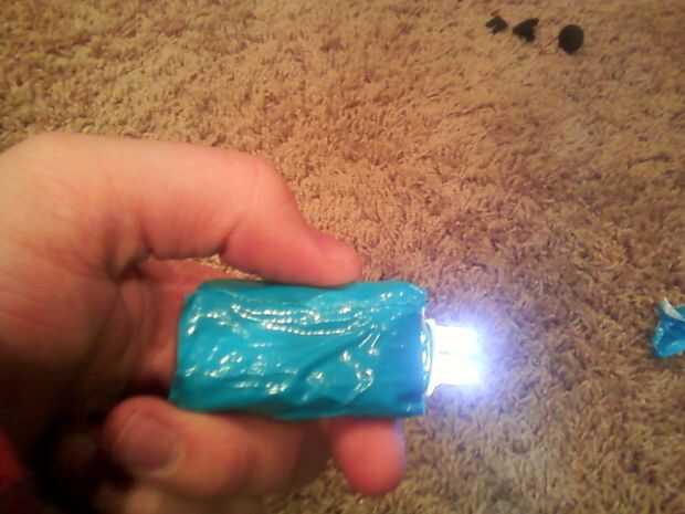 El interruptor de botón momentáneo al otro lado de las baterías con cinta adhesiva.